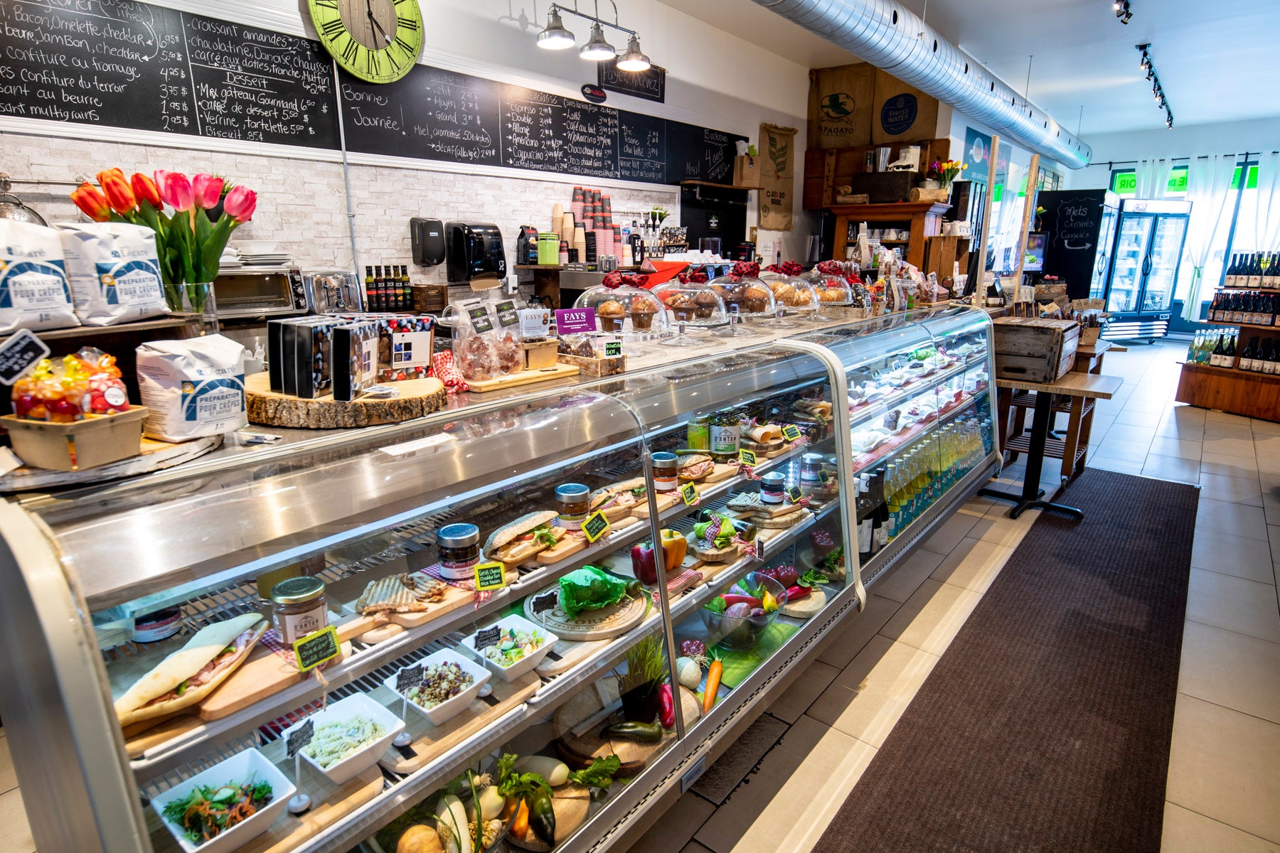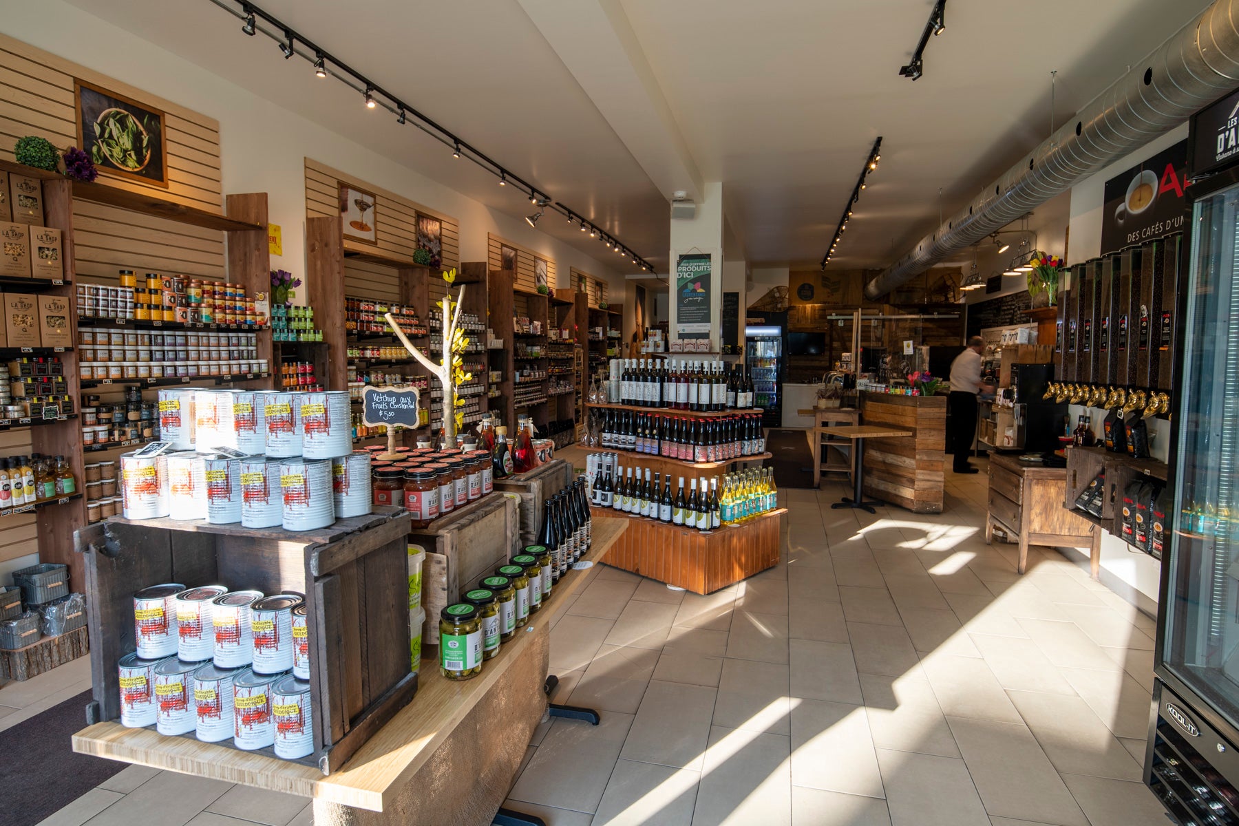 Boutique de produits du terroir et comptoir cafés/sandwichs/saldes pour emporter.