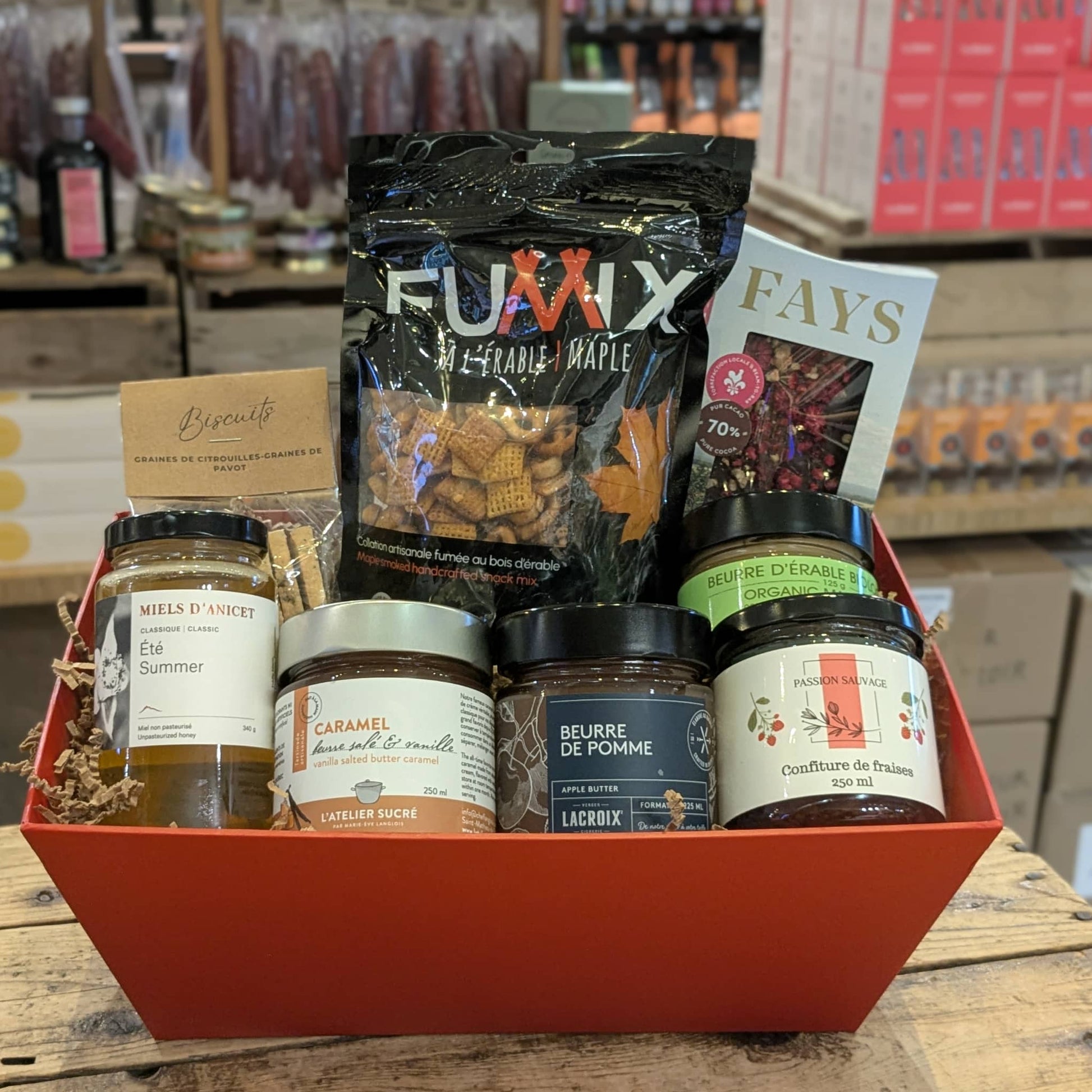Tablette chocolat framboises Fays, chocolaterie, miel clair des Miel d'Anicet, beurre de pomme du Verger Lacroix, Fumix collation à l'érable, beurre d'érable Érablière Varin, confiture de fraises de Passion sauvage, Caramel salé vanille de l'atelier sucré par Marie-Eve Langlois, dans un panier, biscuits Atelier lune, emballé dans un cello avec des rubans.