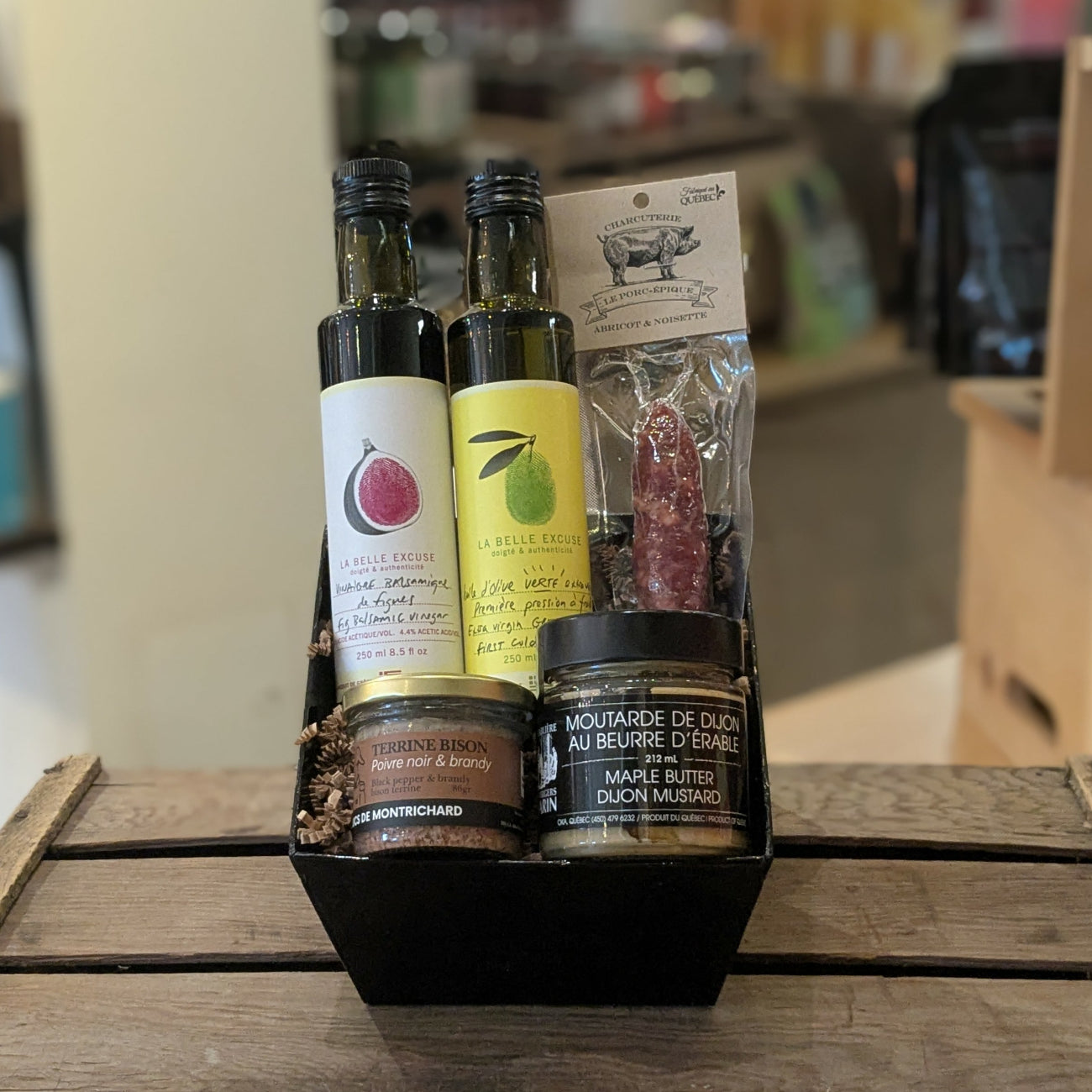 Vinaigre balsamique à la figue de La belle excuse, huile d'olive verte de La belle Excuse, moutarde dijon érable de l'érablière Varin, terrine de bison brandy et poivre noir de Duc de Montrichard, saucisson Porc-épique dans un panier noir, emballé dans un cello avec rubans.