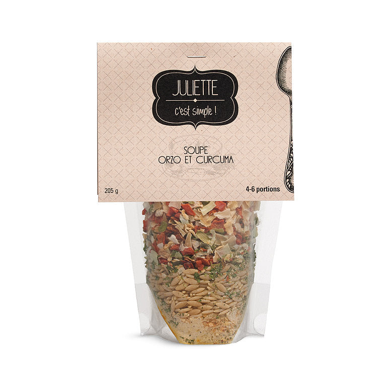 - Ingrédients: Orzo, légumes déshydratés, bouillon de poulet sans gluten, oignon, curcuma, ail, poivre, fenouil, thym, romarin feuille de laurier.